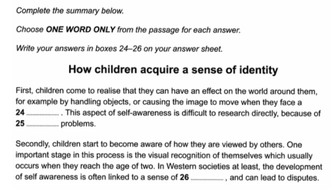 Dạng câu hỏi này sẽ đưa cho bạn một bài tóm tắt những thông tin từ bài đọc IELTS Reading, trong đó sẽ có nhiều chỗ bỏ trống. Nhiệm vụ của bạn hoặc là lựa chọn những từ thích trong số các từ đề bài đã cung cấp sẵn, hoặc tự tìm câu trả lời trong bài đọc, để điền vào những chỗ trống ấy. Đề bài sẽ cho bạn số lượng từ nhiều hơn số lượng các chỗ trống. Tất cả các thông tin ở trong bài tóm tắt cũng cũng xuất hiện trong bài đọc, nhưng trong bài tóm tắt sẽ sử dụng từ đồng nghĩa và paraphrases, chứ không lặp lại y hệ những từ có trong bài